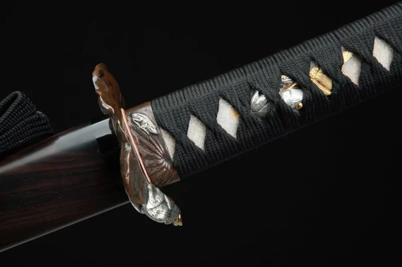Die Tsuba, aus reinem Kupfer gefertigt und mit fein gearbeiteten Details aus vergoldetem Silber verziert, ist ein wahres Schmuckstück. Sie kombiniert Eleganz mit Funktionalität und bietet nicht nur zuverlässigen Handschutz, sondern auch eine künstlerische Dimension, die das Gesamtbild des Katanas bereichert. Das Kupfer, verstärkt durch die silbernen Verzierungen, verleiht der Tsuba ein perfektes Gleichgewicht zwischen Raffinesse und Robustheit – ein Symbol für die meisterhafte Handwerkskunst, die dieses Katana auszeichnet.