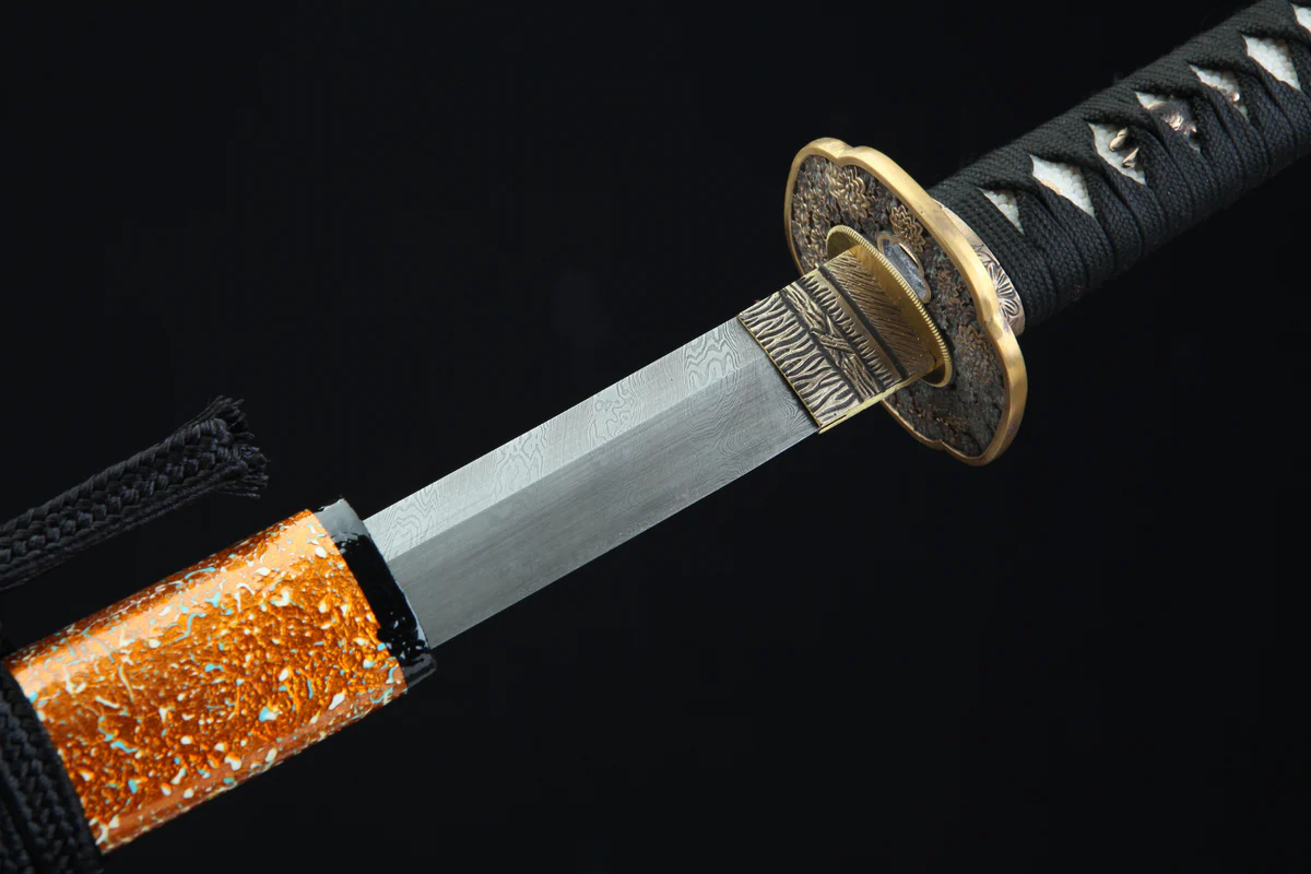 Der Saya aus lackiertem Holz in einem leuchtenden Orange symbolisiert Vitalität und Leidenschaft und bildet einen auffälligen Kontrast zur schlichten Damaszenerklinge. Der mit Baumwolle geflochtene Sageo sorgt nicht nur für sicheren Halt des Saya beim Tragen, sondern bietet auch zusätzlichen Komfort. Diese harmonische Kombination macht den Saya zu einem visuellen Highlight und bietet gleichzeitig zuverlässigen Schutz für die Klinge.
