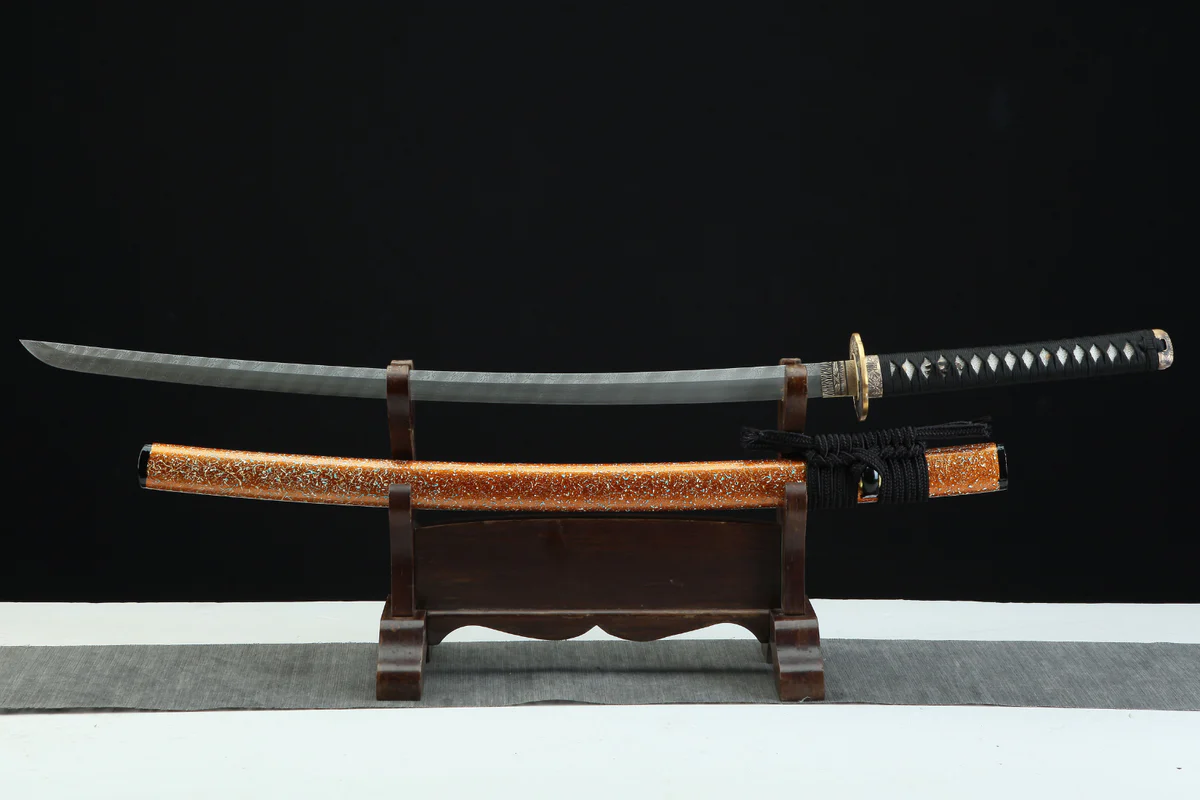 Das Katana Rōtasu ロータス ist ein außergewöhnliches Meisterwerk, das japanische Tradition mit einer lebendigen und raffinierten Ästhetik verbindet. Seine Damaszenerstahlklinge, die feinen Kupferverzierungen und der strahlend orangefarbene Saya machen es zu einem beeindruckenden Stück Kampfkunst. Entwickelt für anspruchsvolle Sammler und Liebhaber von Katanas, verkörpert dieses Schwert sowohl Kraft als auch Anmut und reflektiert die Essenz der japanischen Schmiedekunst in jedem Detail.